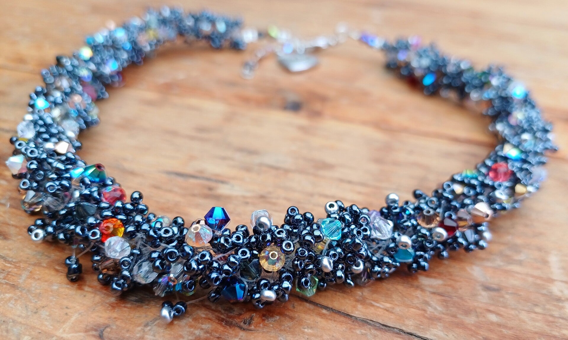 Deze halsketting bestaat uit kleine glaskraaltjes (rocailles) en Swarovski steentjes.