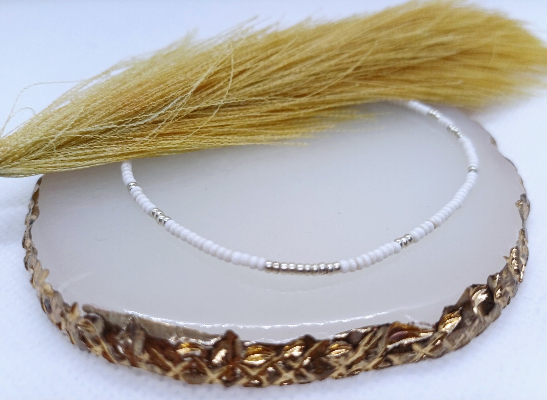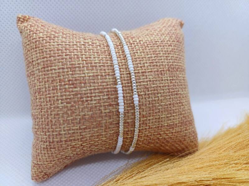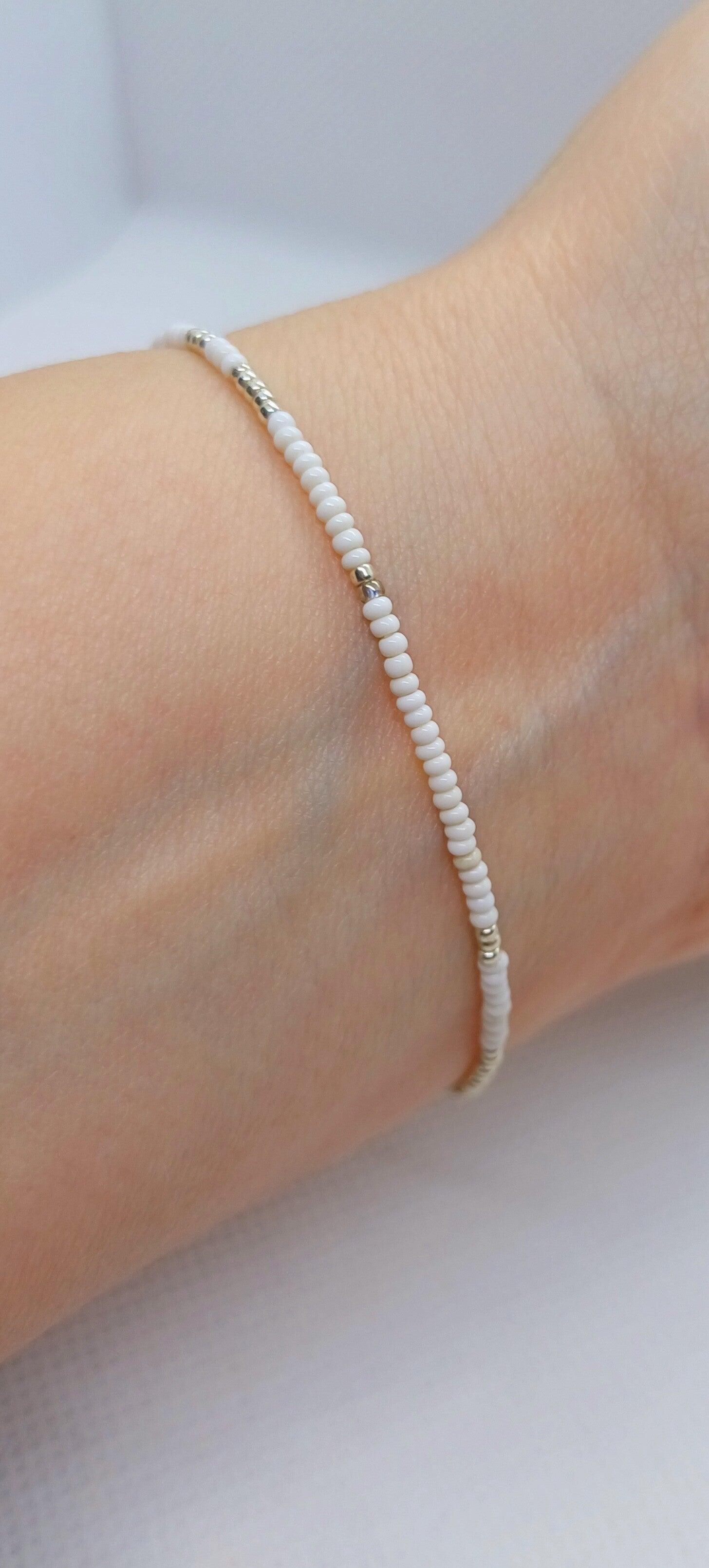 Dit verfijnde armbandje uit de LumiLijn-collectie is gemaakt met zilverkleurige 15/0 Miyuki glaskraaltjes en witte gerecycleerde kralen. Elk kraaltje werd met zorg geregen en het armbandje is afgewerkt met een handige schuifknoop.