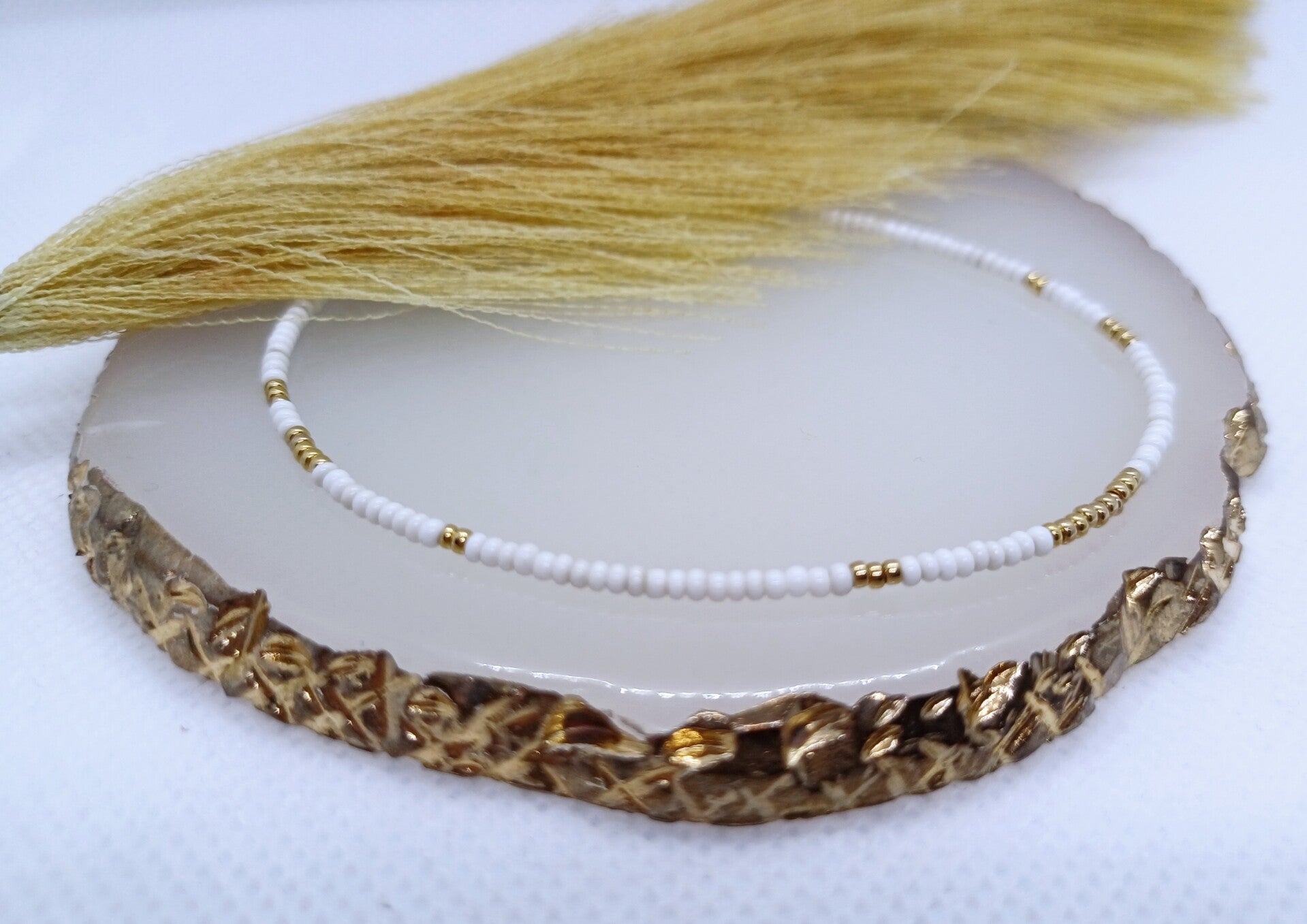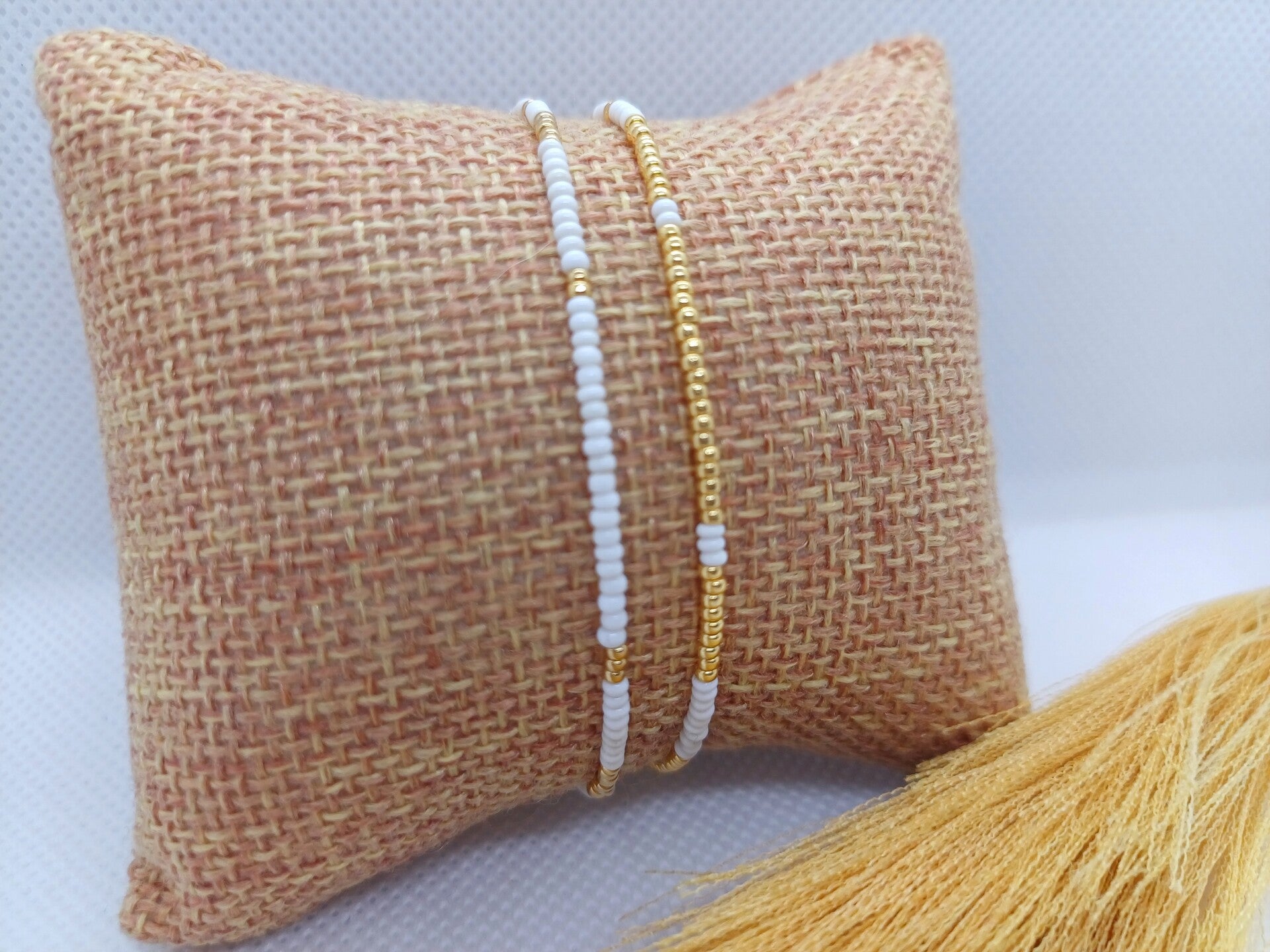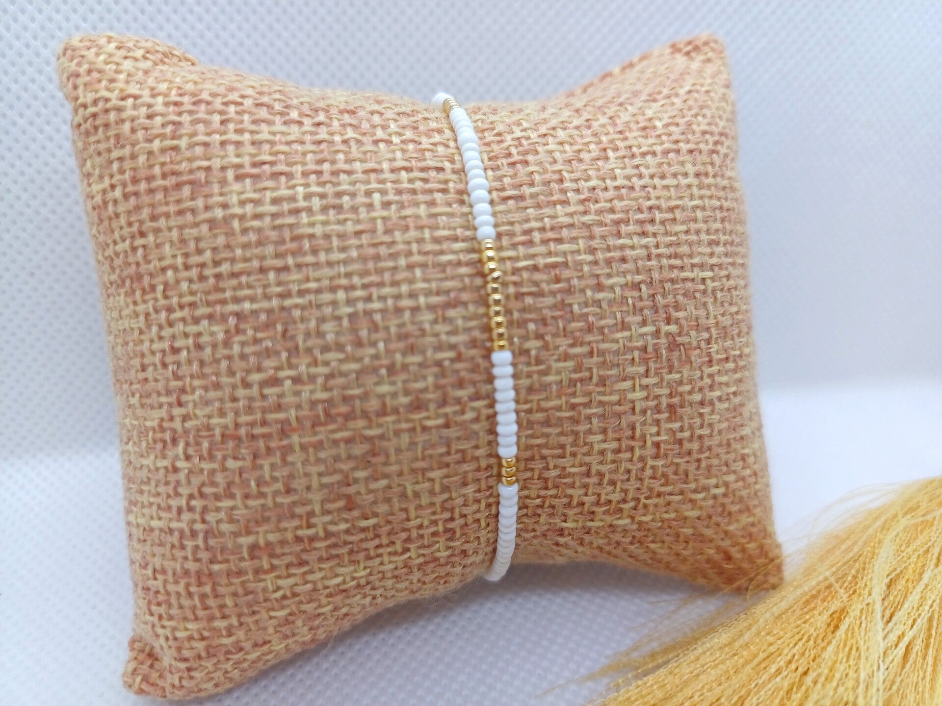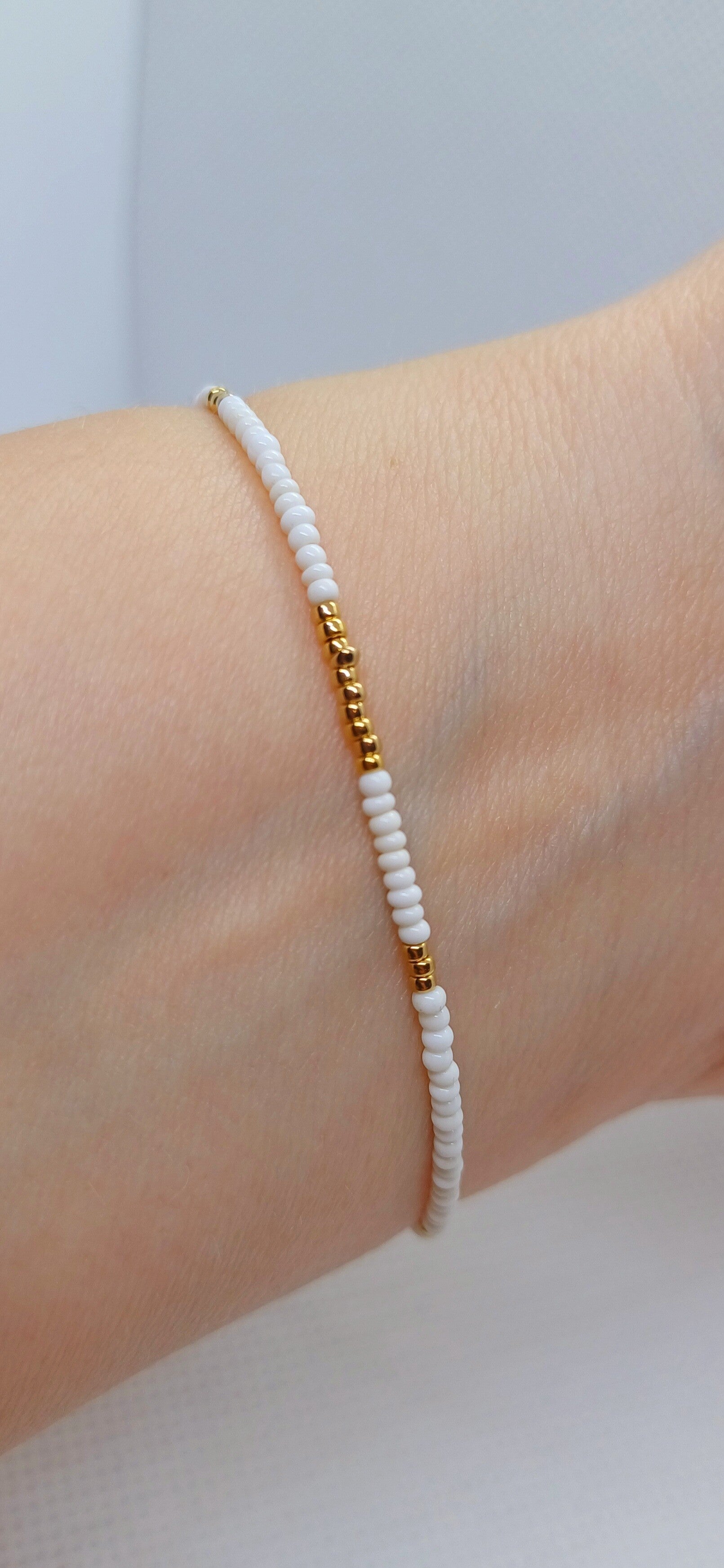 Dit armbandje bestaat uit goudkleurige 15/0 Miyuki glas- en witte gerecycleerde kraaltjes.