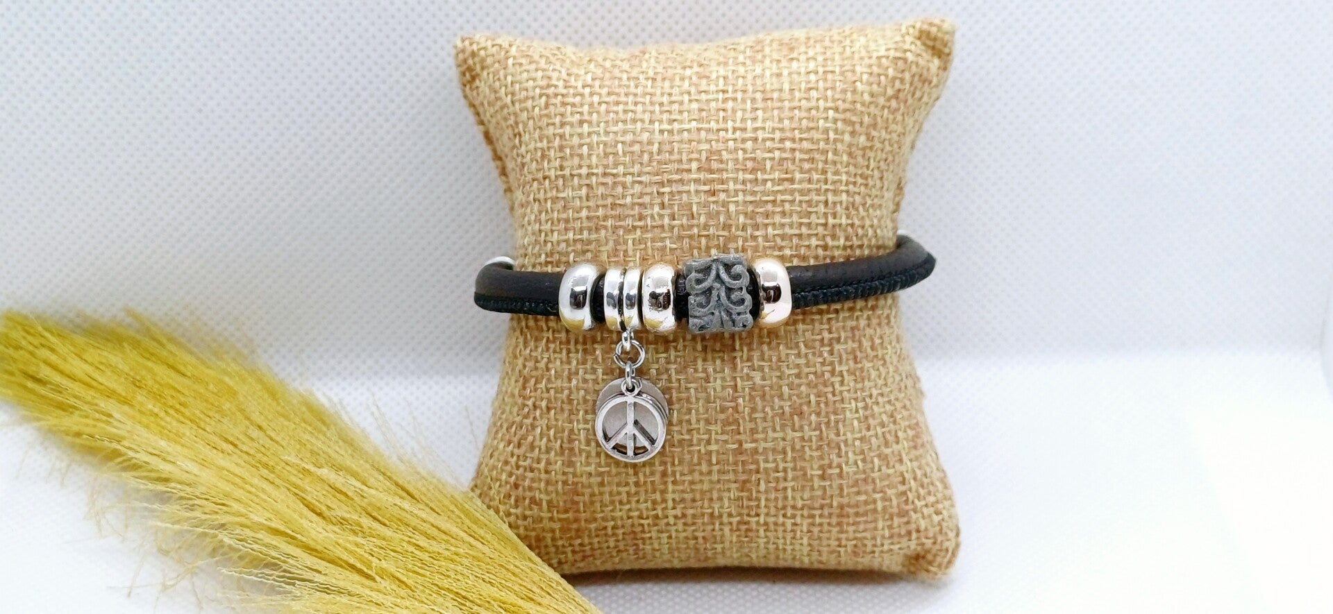 VredesKracht is een stoere armband, handgemaakt met zwart leder, zilverkleurige accenten en een opvallende peace-teken bedel.