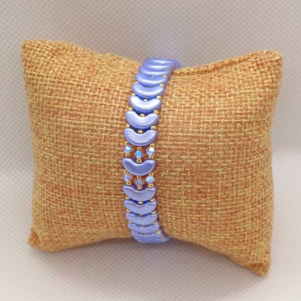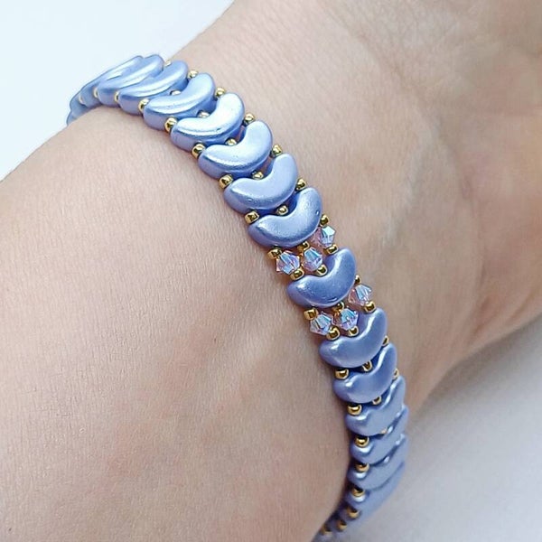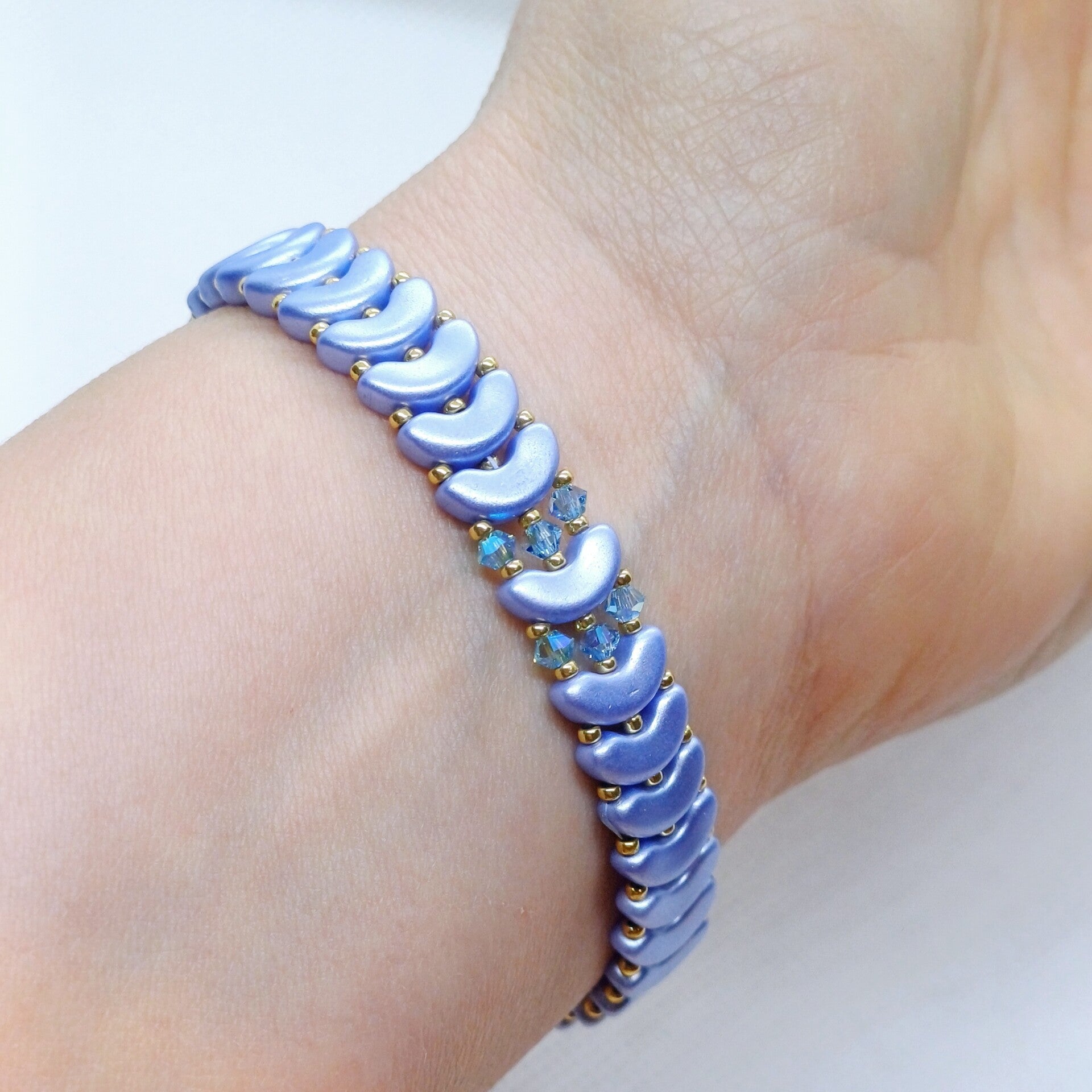 Laat je betoveren door ParelMaan, een handgemaakte armband die zachtjes straalt als maanlicht op een heldere nacht. De combinatie van lavendelblauwe glaskralen, schitterende Swarovski-kristallen en gouden Miyuki-accenten zorgt voor een tijdloze, vrouwelijke uitstraling. Elk detail is met zorg gekozen en met de hand geregen – voor wie houdt van kwaliteit, elegantie en een tikkeltje magie.