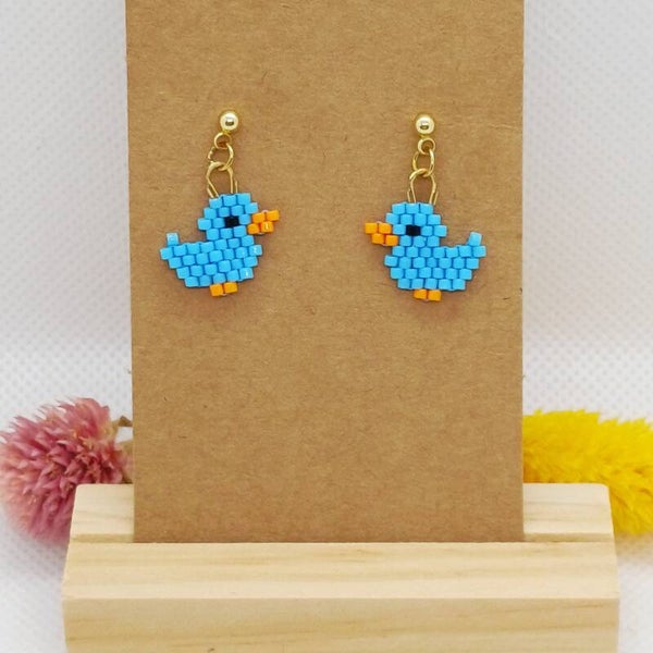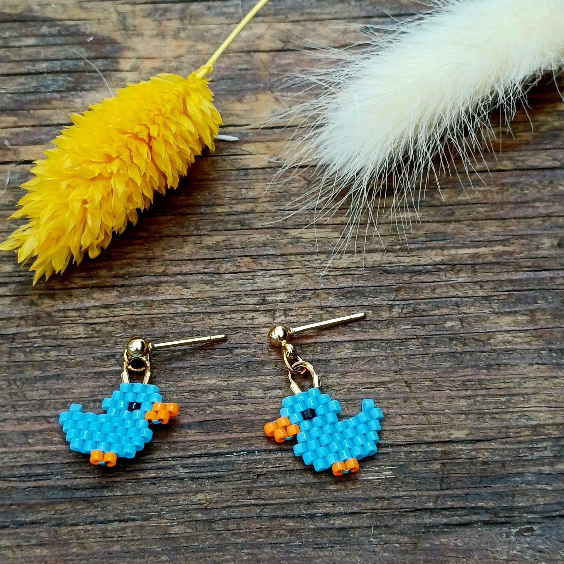 Laat je oren kwaken van plezier met deze superkleine, handgemaakte eendjes! Elk eendje is opgebouwd uit mini Miyuki Delica kraaltjes met de brickstitch techniek – stevig én verfijnd. Ze meten slechts 1 cm en bungelen speels aan een goudkleurig stekertje van roestvrij staal.