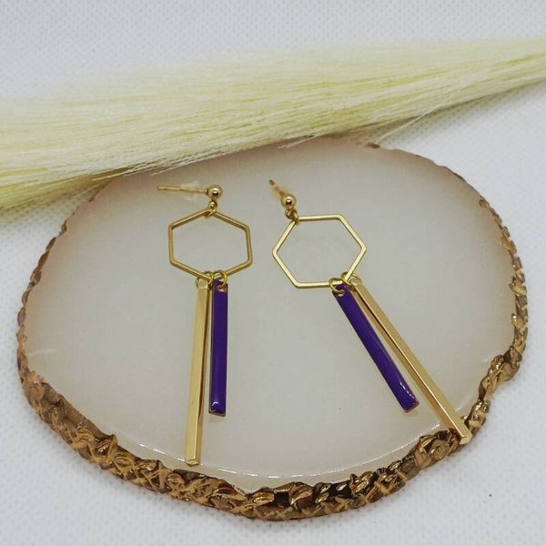 De geometrische zeshoek in goudkleurig RVS vormt samen met het paars geëmailleerde staafje een elegante combinatie. Met hun lengte van 5 cm zijn ze een echte eyecatcher, zonder te zwaar te voelen.
