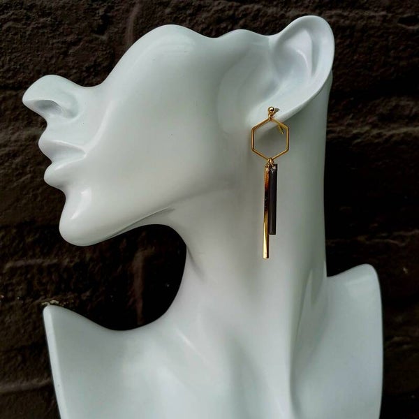Het goudkleurige RVS vormt samen met het grijs geëmailleerde staafje een strak en tijdloos geheel. Met hun lengte van 5 cm zijn ze subtiel aanwezig en geven ze jouw outfit een verfijnde, stedelijke touch.