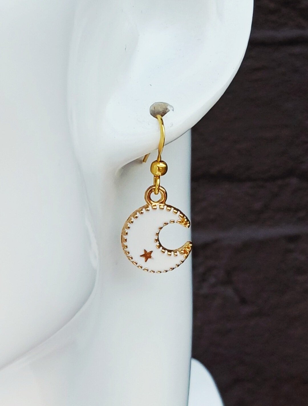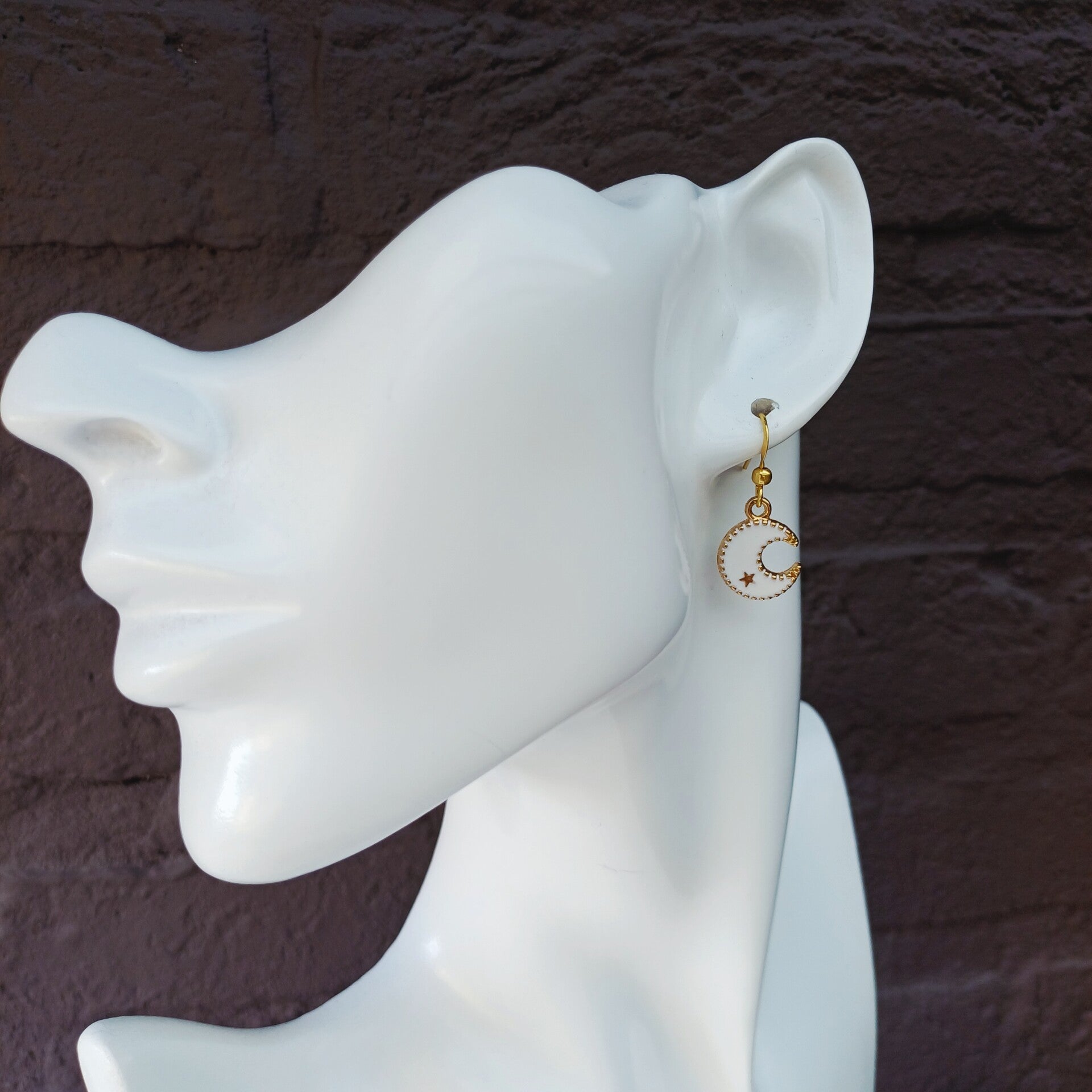 Laat je look stralen met MaanLicht, een elegante oorbel waarin een witte maan subtiel wordt verlicht door een klein gouden sterretje.
