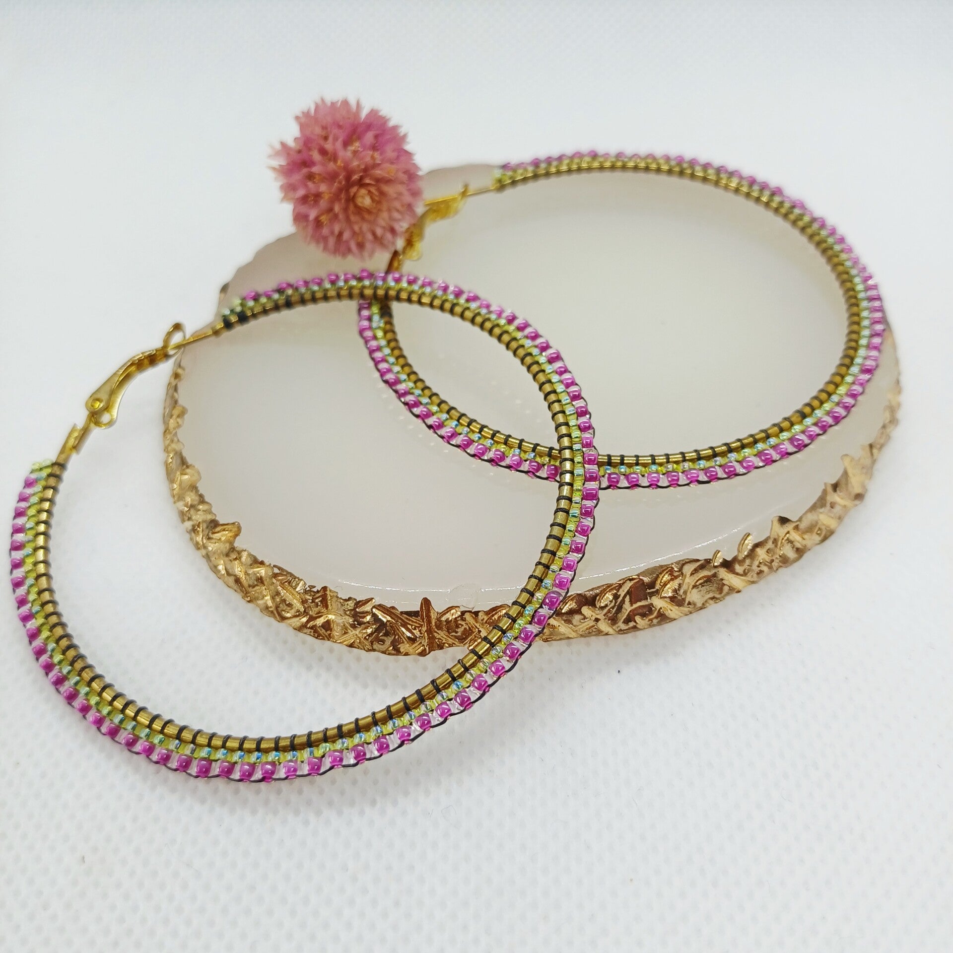 De oorbellen zijn met zorg met de hand genaaid met Miyuki rocailles in paars- en groentinten, subtiel verweven tot een speels maar evenwichtig geheel. Het kleurenspel doet denken aan bloesems in bloei, gevangen in een lichte, elegante cirkel.