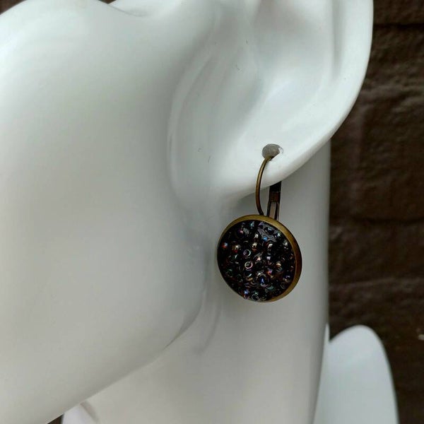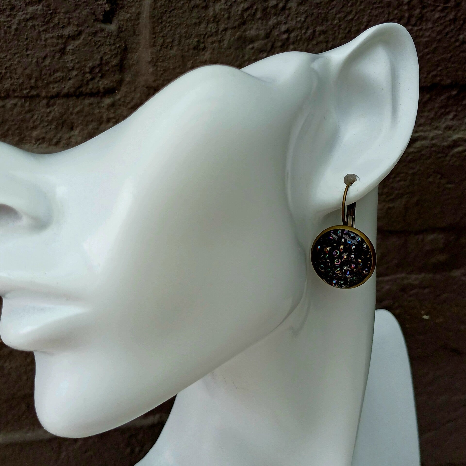 Deze oorstekers zijn met de hand gemaakt van fijne rocailles die zorgvuldig werden ingegoten in epoxy. Elke kraal blijft zichtbaar als een klein lichtpuntje, samen gevangen in een koperkleurige omlijsting. Het resultaat is een compacte oorbel met diepte, glans en karakter.