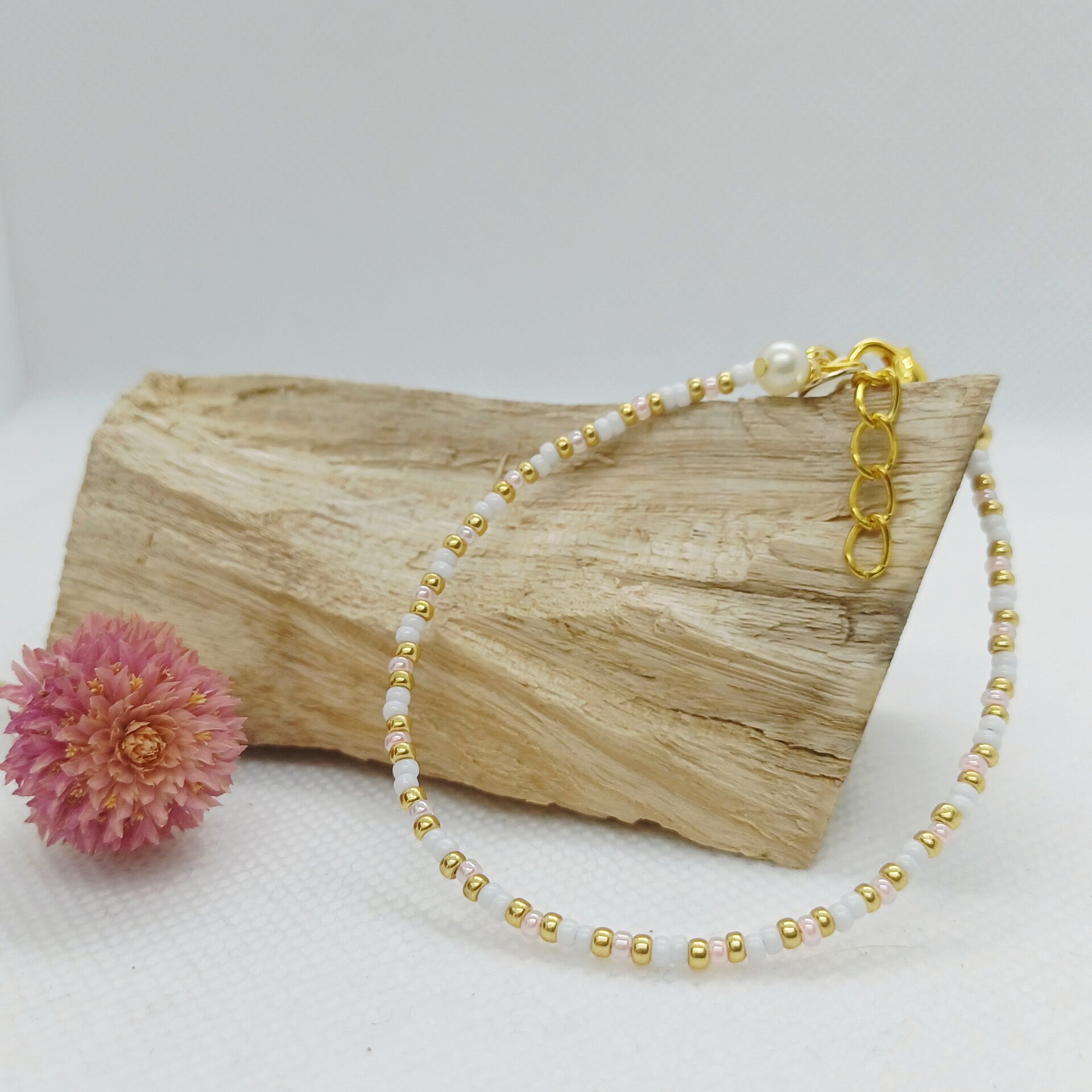 ParelZacht is een subtiele, tijdloze armband die zachtheid en elegantie moeiteloos combineert. De fijne kralen in zachte pareltinten worden harmonieus afgewisseld met goudkleurige accenten, wat zorgt voor een lichte en verfijnde uitstraling.