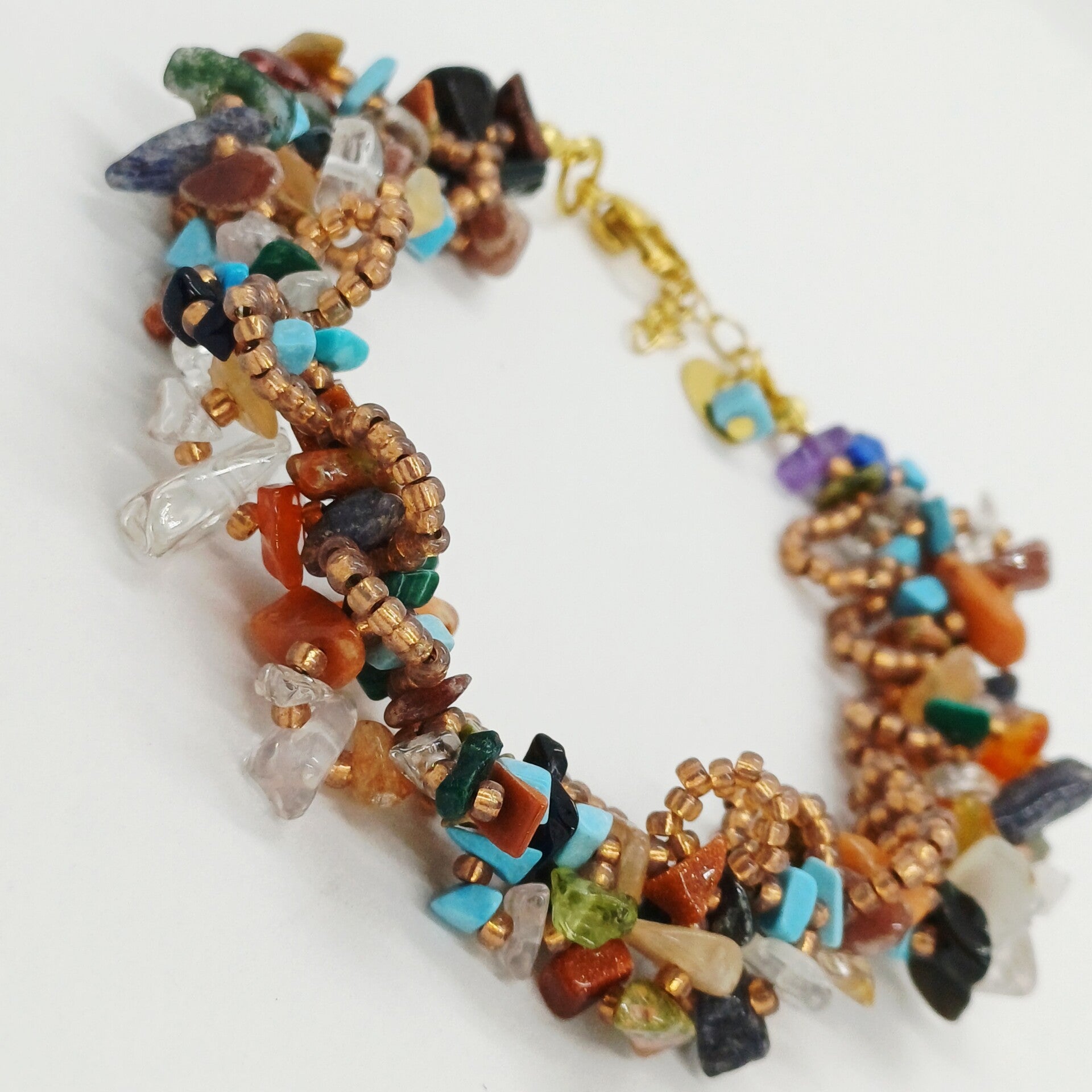 Laat je betoveren door de warme kleuren van AardeFluistering. Deze handgemaakte armband combineert een speels mozaïek van halfedelsteen chips met fijne Miyuki rocailles in een zachte koperkleurige tint.